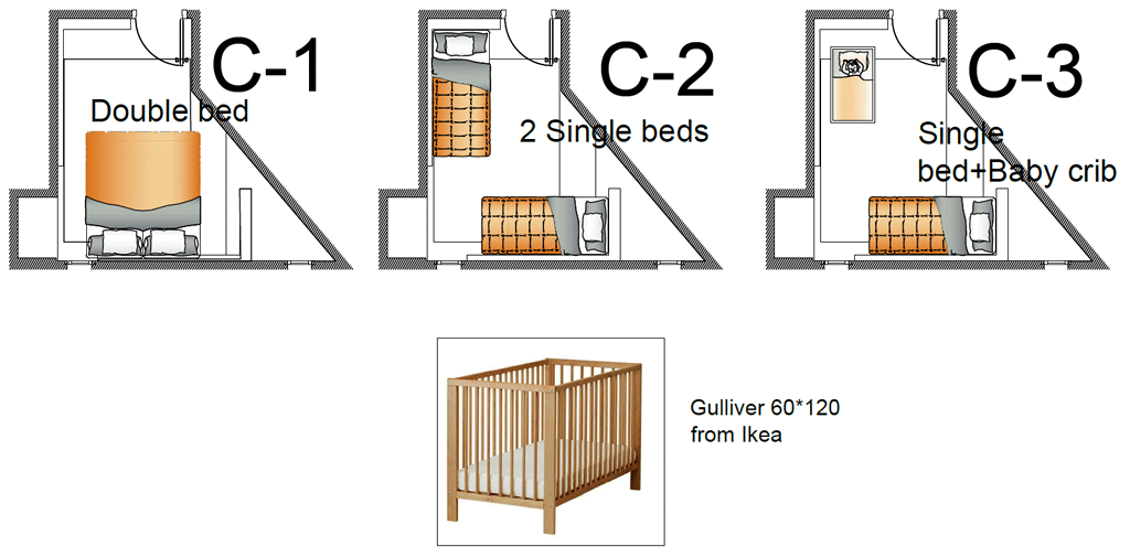 This bedroom has three options, either with the beds together or separate or the possibility of having a baby’s crib. You can see this in the following image.