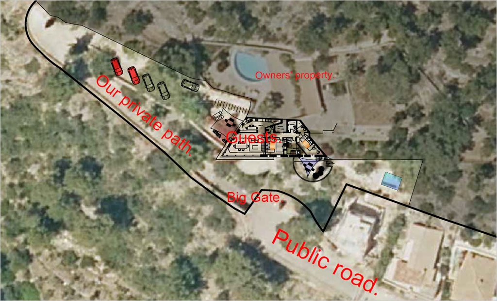 After crossing the gates, the private road leads up to the parking spaces and the Es Vermell houses.